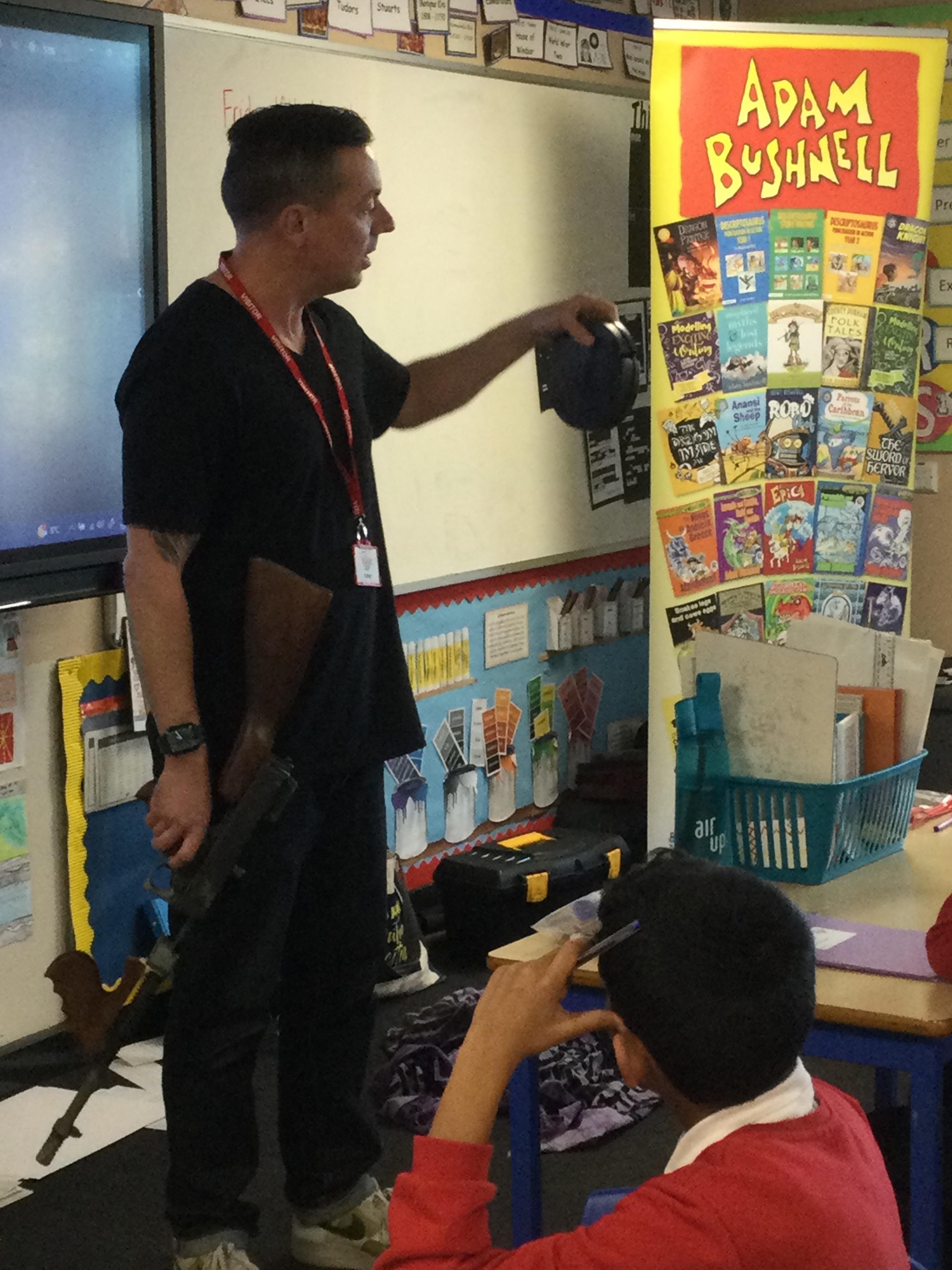 Year 6 had the pleasure of a visit from Adam Bushnell. The focus for the session was World War 2 and the Blitz. During the afternoon, Adam showed replica weapons and used the five senses to help pupils to imagine what it would have been like to have been around during the Blitz. From this, pupils created fantastic first-hand recounts. They finished the afternoon off by creating a piece of artwork with a gas mask as the focus.