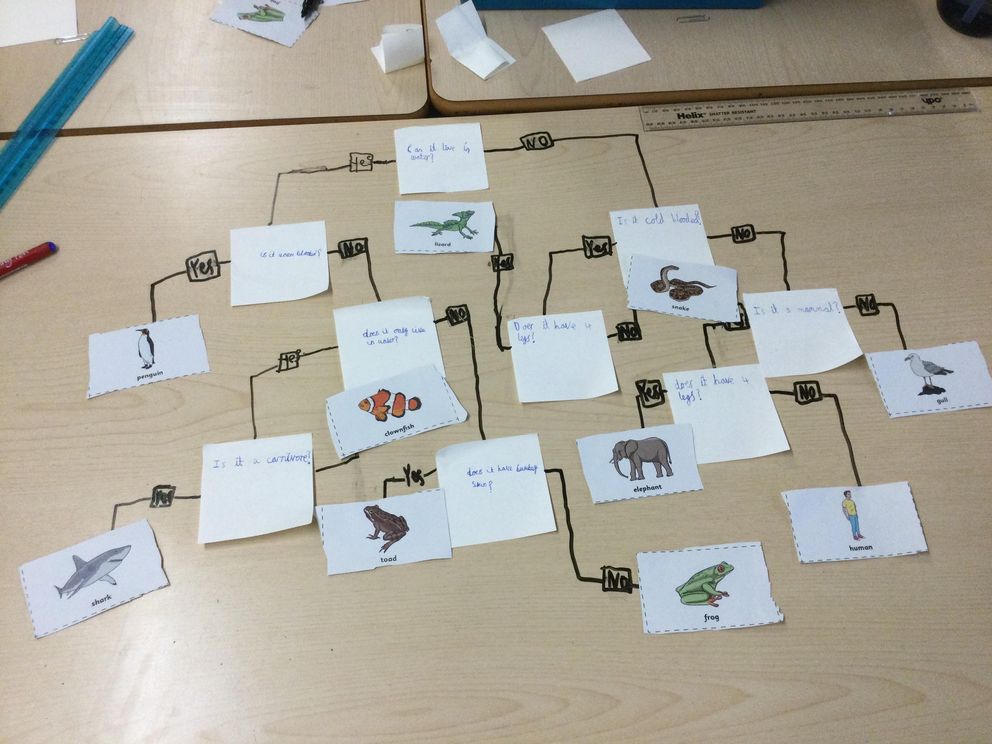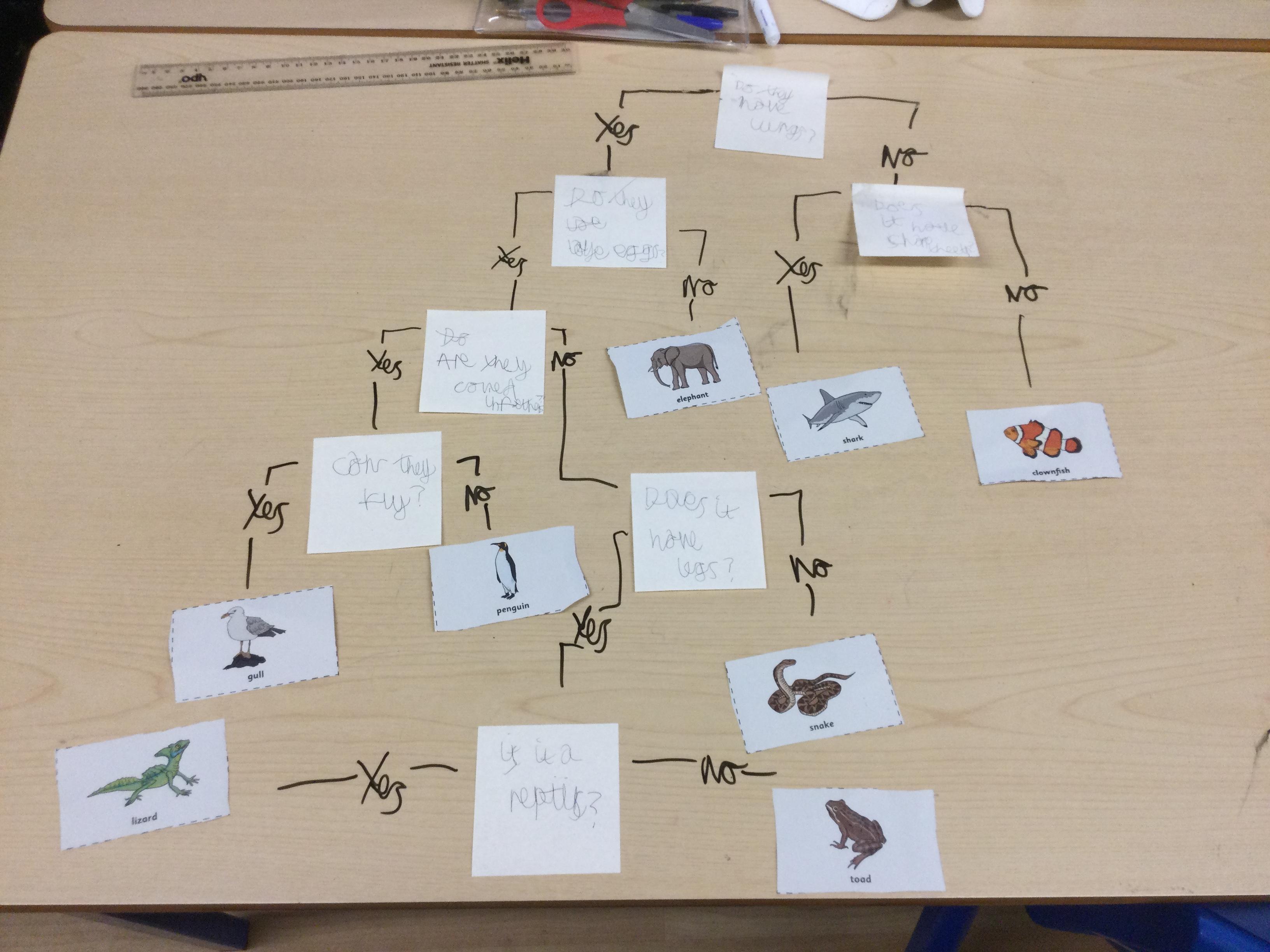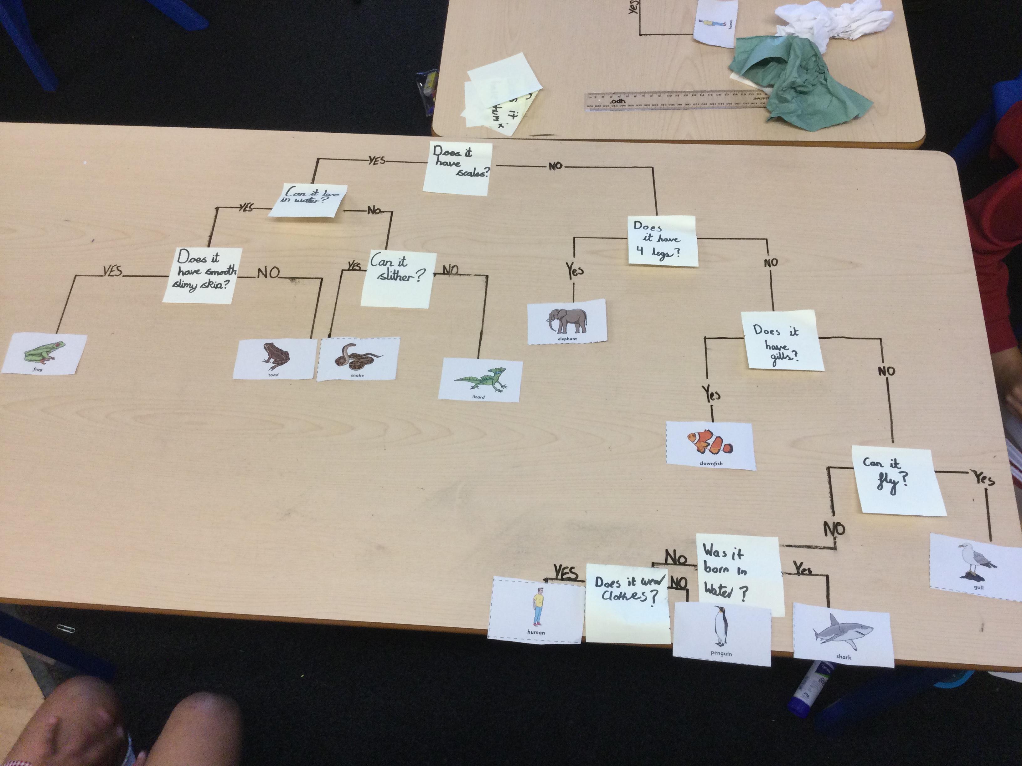 As part of our work on classifying animals, we created our own classification key. To do this, we created a set of scientific questions to group animals as to whether the answer to the question was yes or no. We set our work out on our tables so that we could see it clearly. After we had completed our classification keys, we then checked other groups to see if they were accurate. We really enjoyed carrying out this activity.