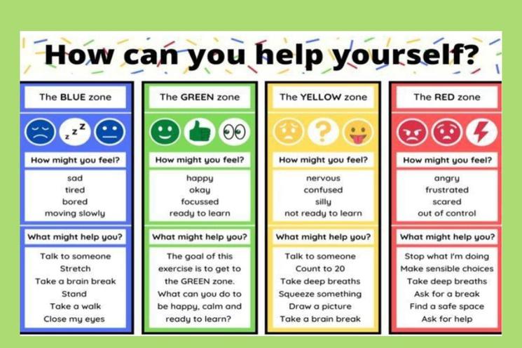 The Zones of Regulation is an approach designed to help everyone recognise their feelings and learn strategies to help regulate these feelings.