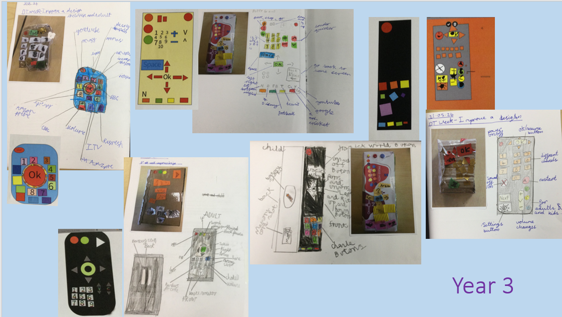 During DT Week we worked together as a whole school just like a real design company to; design TVs and Remote Controls; improve our designs a number of times; share our designs with others. We also looked at the history of the televisions and how world events drove the technology