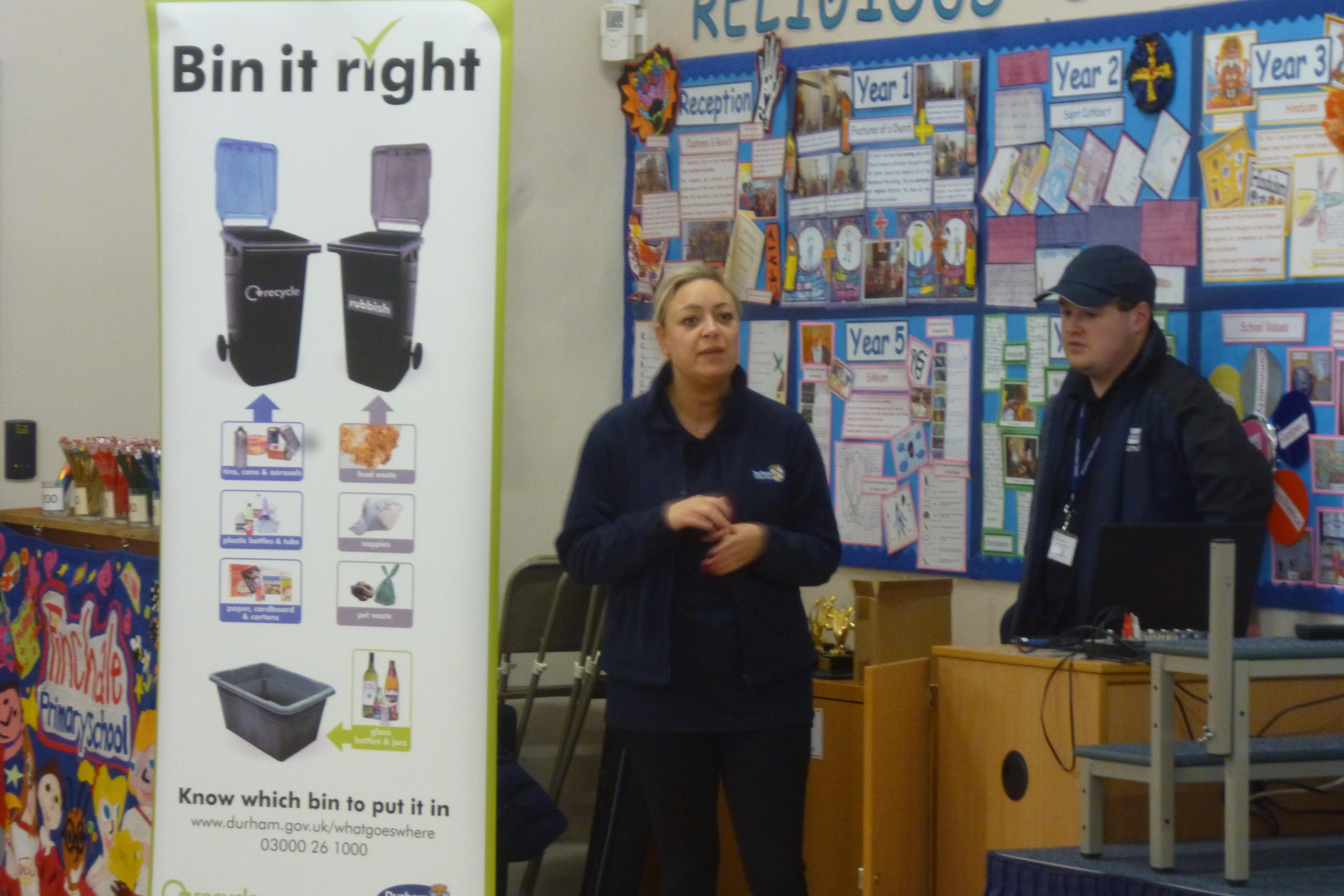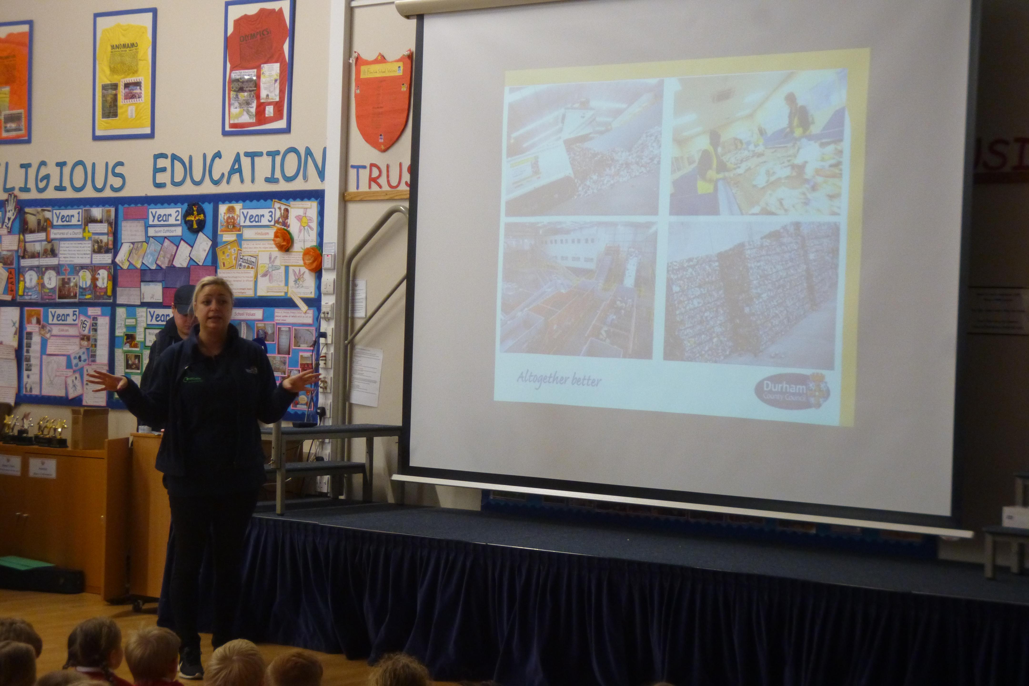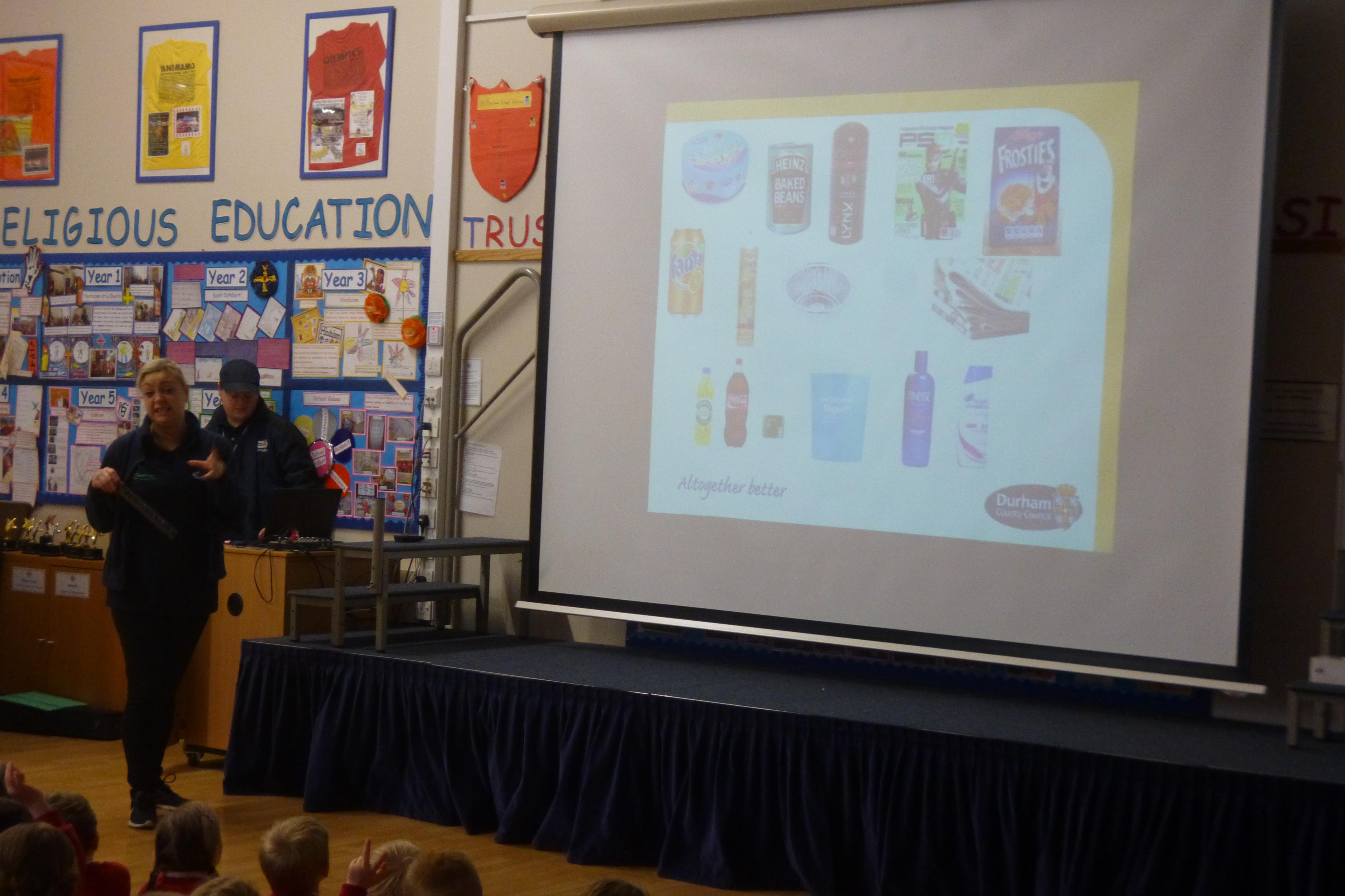 Katie and Chris from Durham County Council Waste Management came to talk to us about how recycling matters. Katie explained to pupils and staff how important it is to recycle everything we possibly can and explained how we can all help. We talked about caring for our environment and how to recycle correctly. We learnt which bins to use for different items and she showed us alternatives to single use plastics.