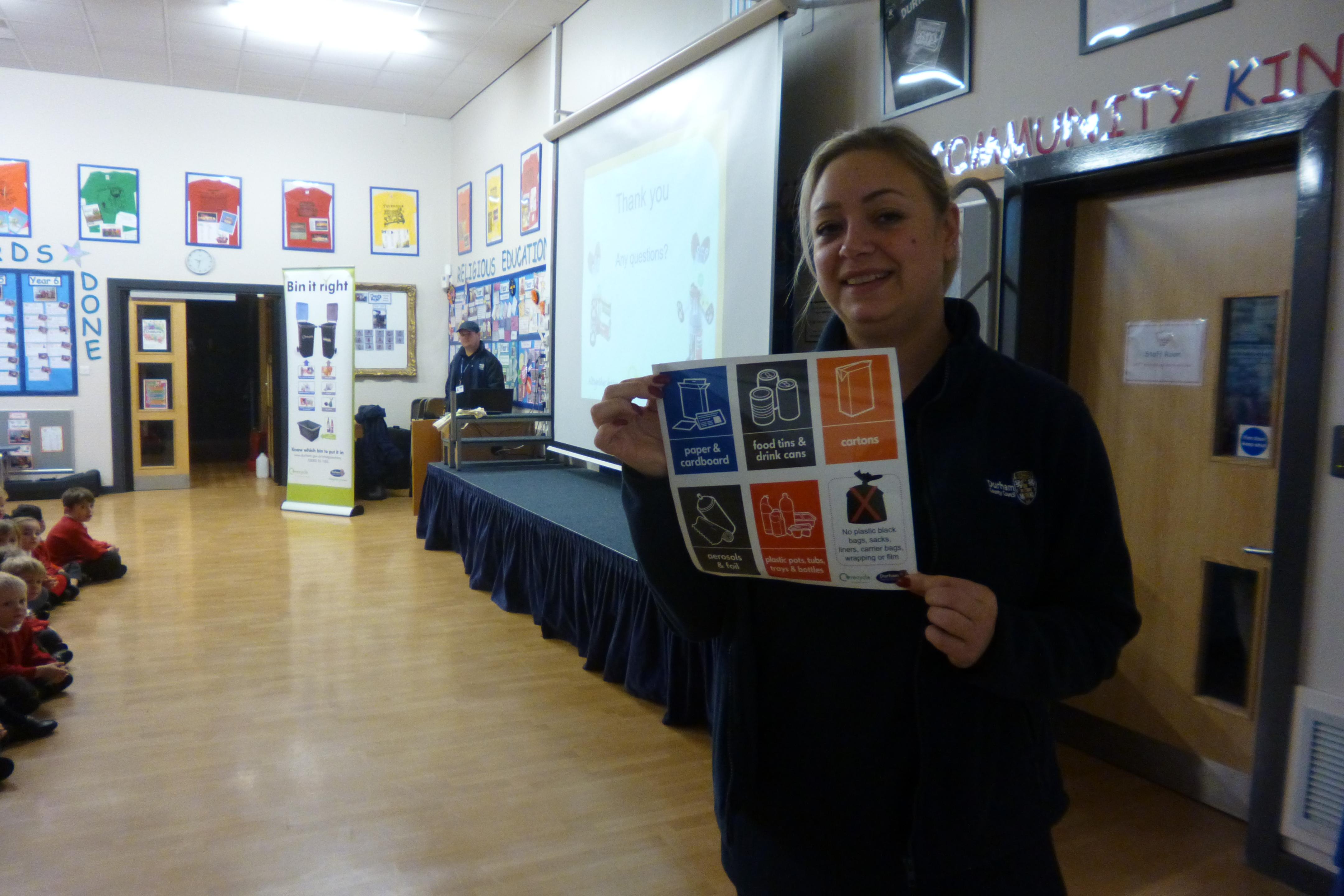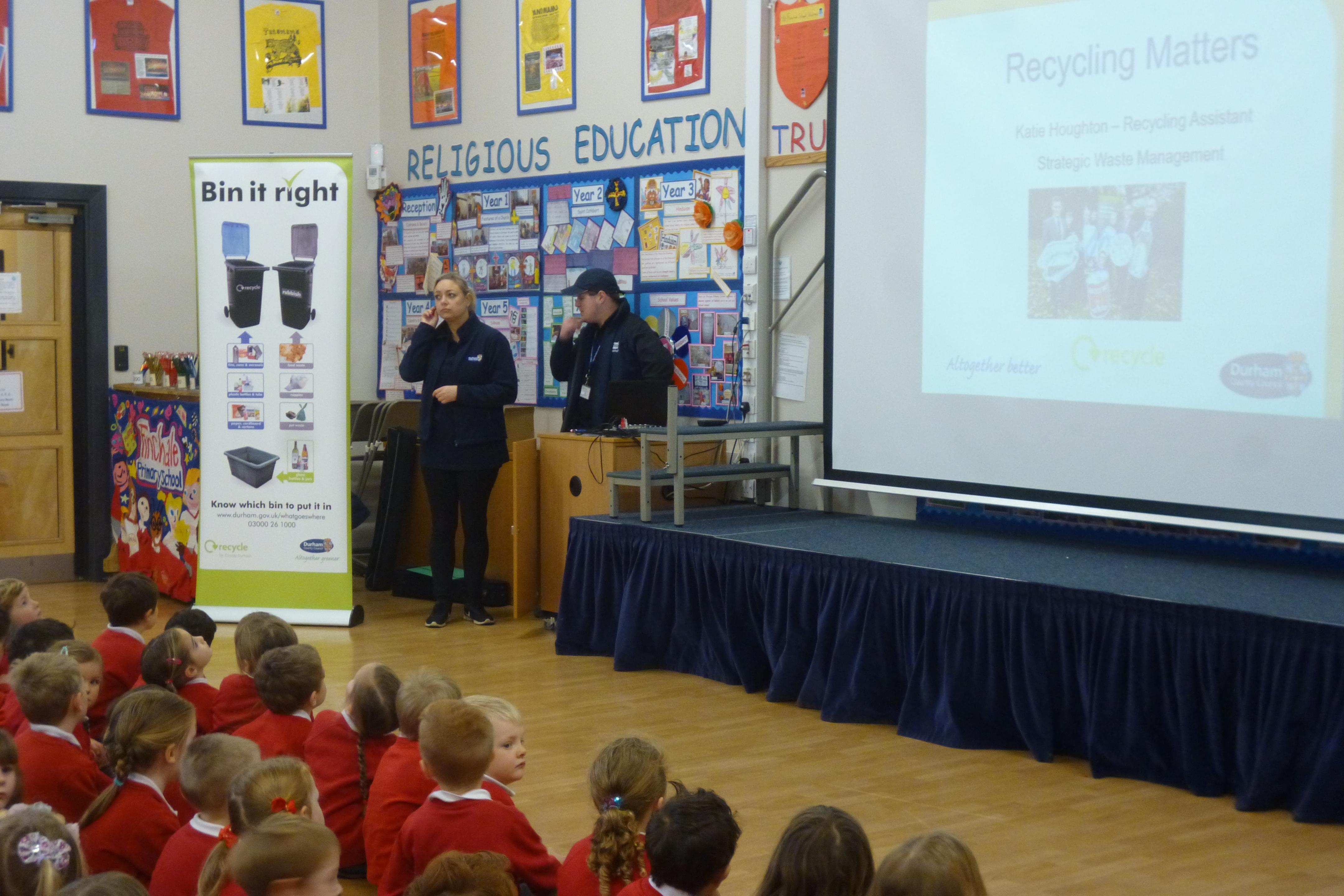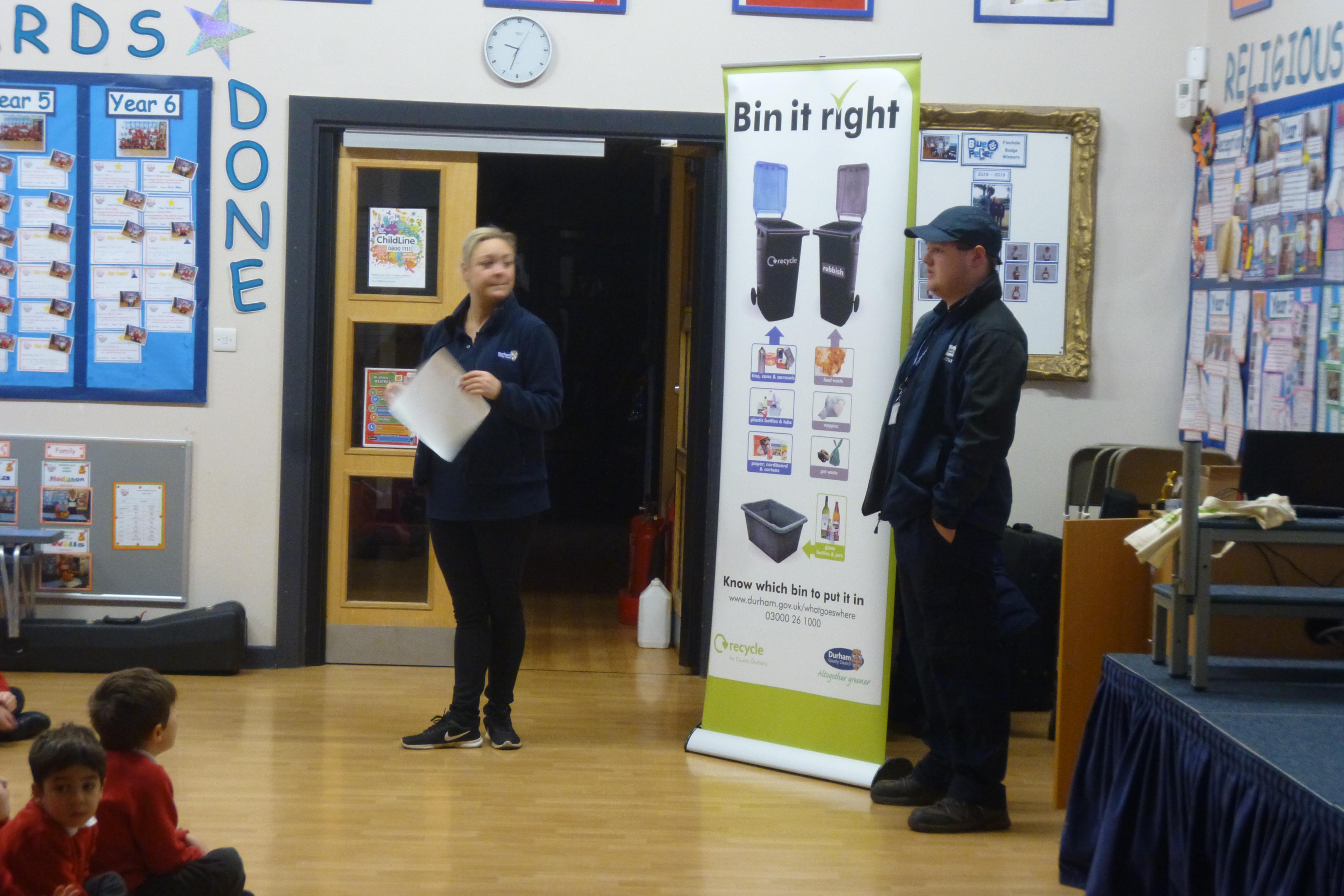 Katie and Chris from Durham County Council Waste Management came to talk to us about how recycling matters. Katie explained to pupils and staff how important it is to recycle everything we possibly can and explained how we can all help. We talked about caring for our environment and how to recycle correctly. We learnt which bins to use for different items and she showed us alternatives to single use plastics.