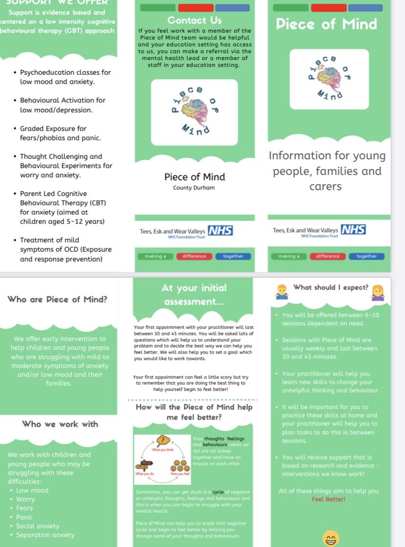 We are very lucky to be a school with access to support from the NHS Piece of Mind team (formerly Mental Health Support team). They offer a wide range of mental health interventions and provide valuable support to schools in the delivery of assembles, whole class and individual support. They also deliver Parent-led CBT sessions to enable families to be better informed on how to confidently help their anxious children. For more information contact Mrs Rice, Wellbeing Co-Ordinator at Finchale Primary School.