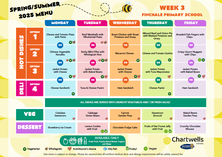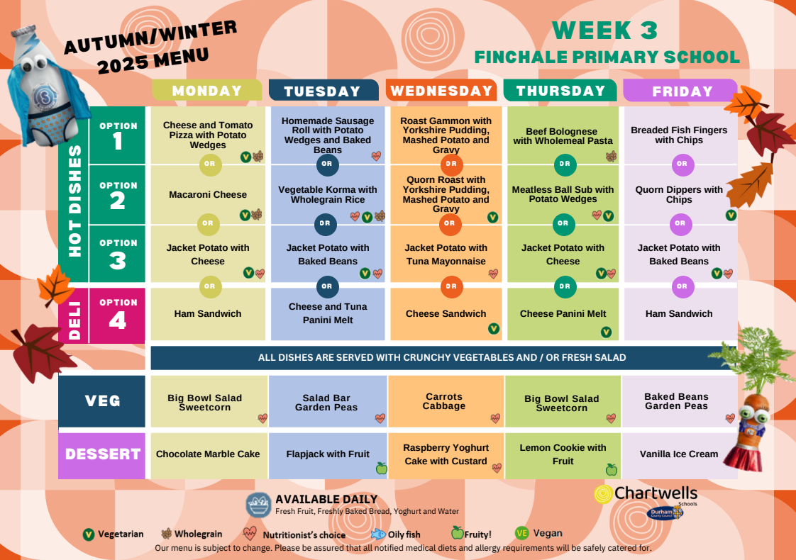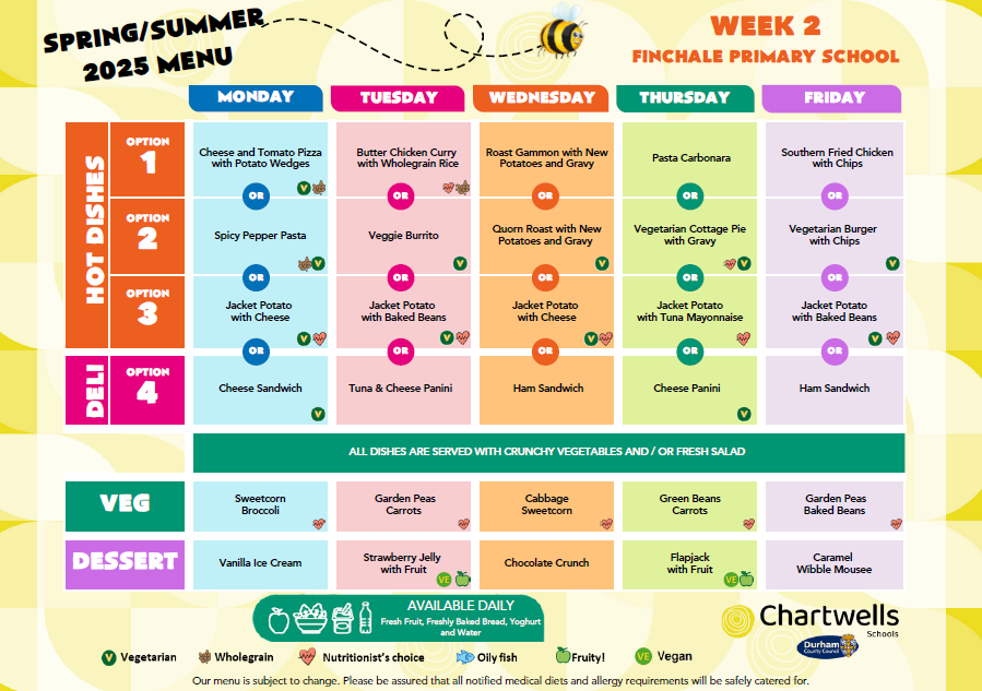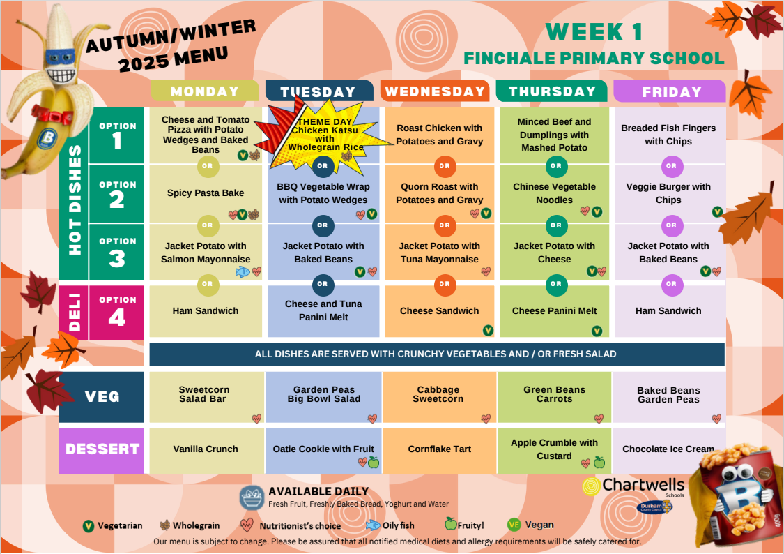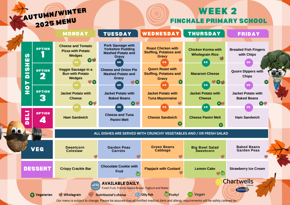 From September 2022 we have a new contractor, Chartwell's. They have worked with the local authority to provide a balanced menu over a week, following Government guidelines. There is always fruit available, and custard with some desserts forms part of the dairy element of a diet.