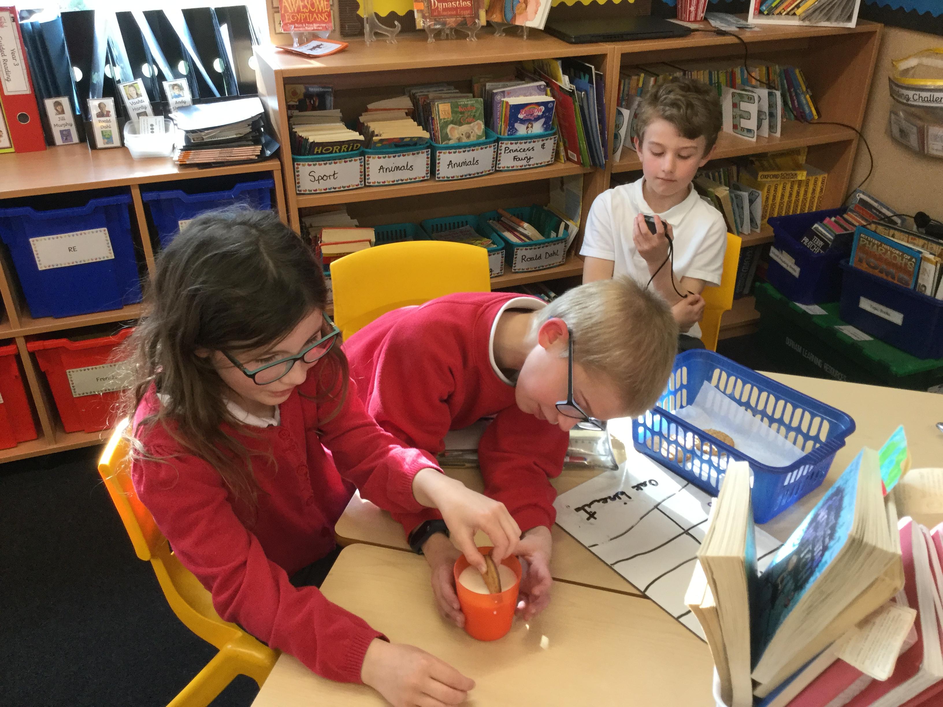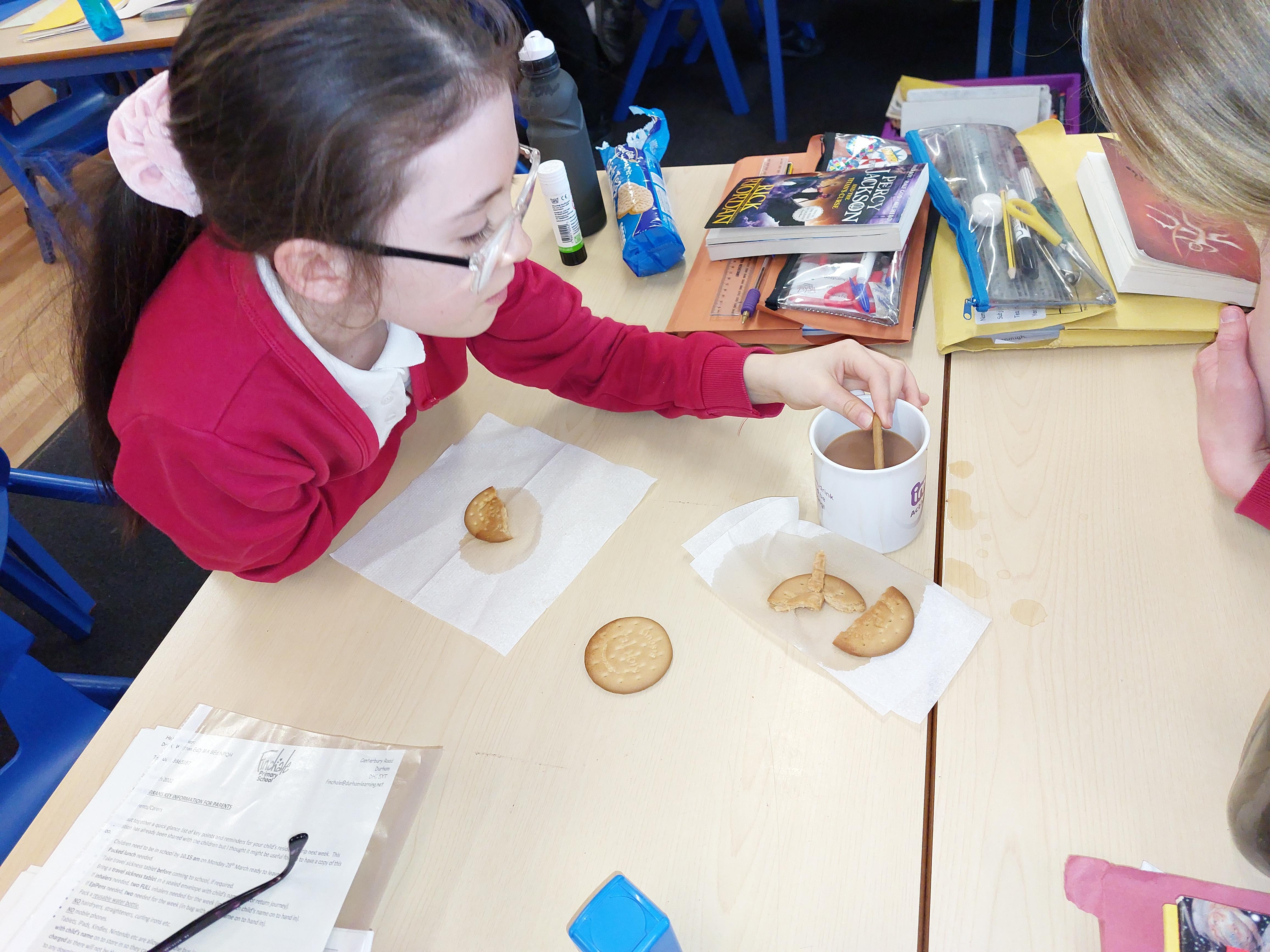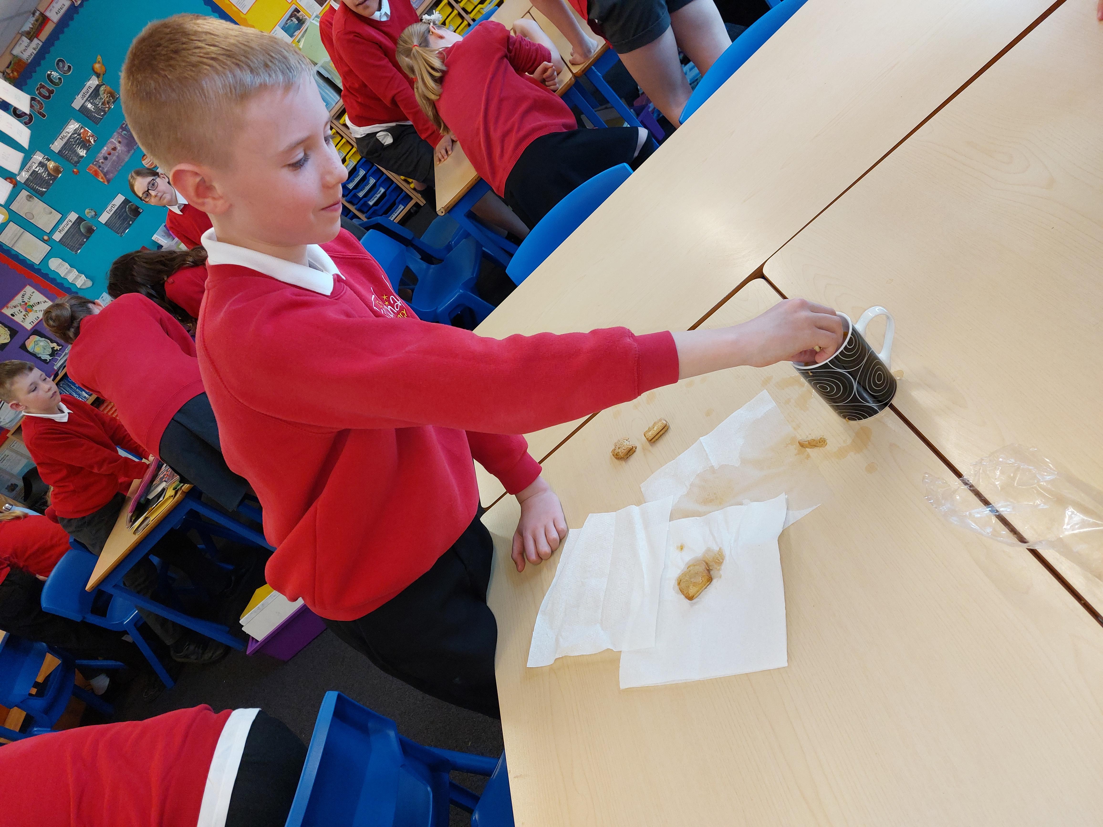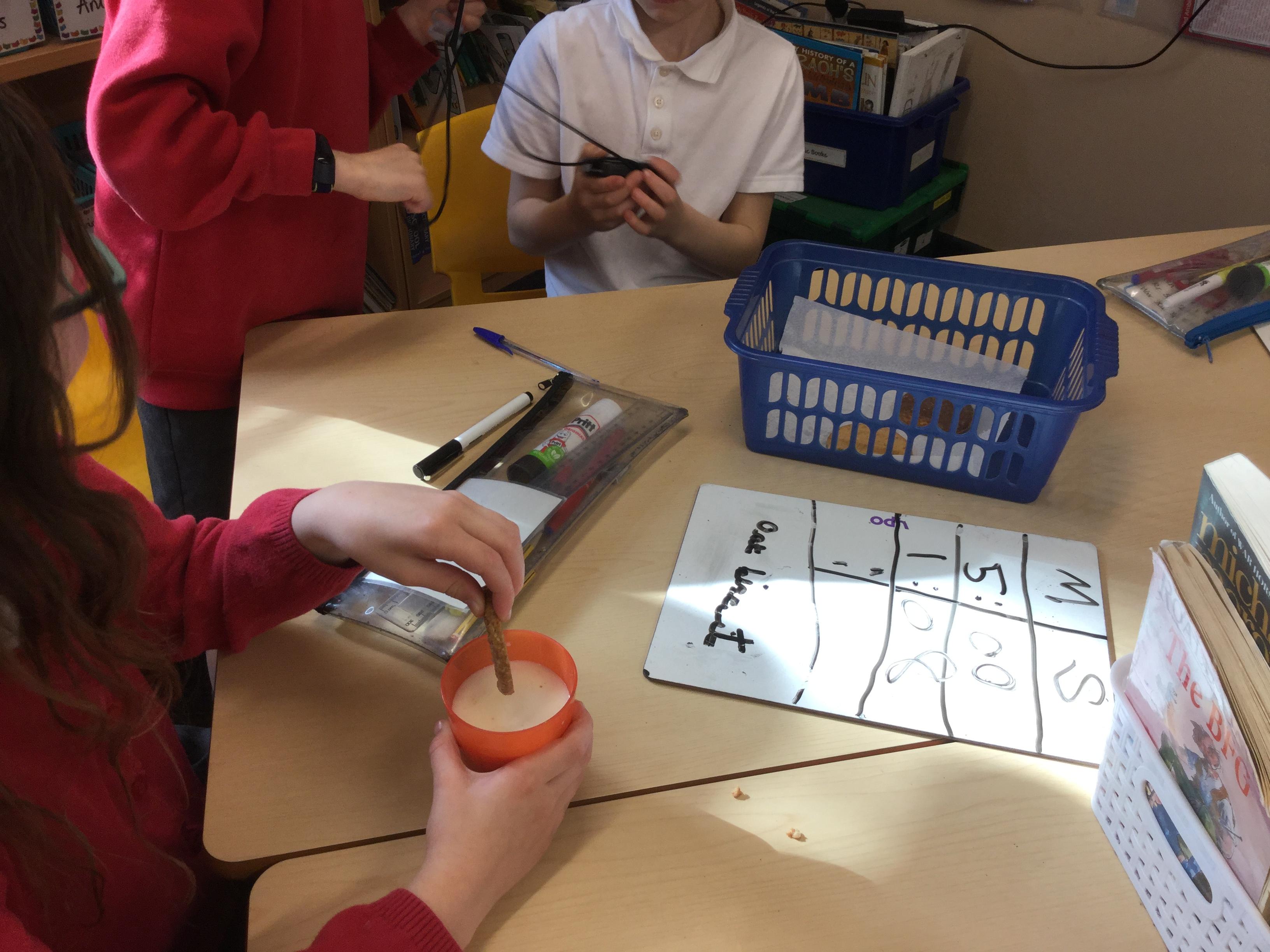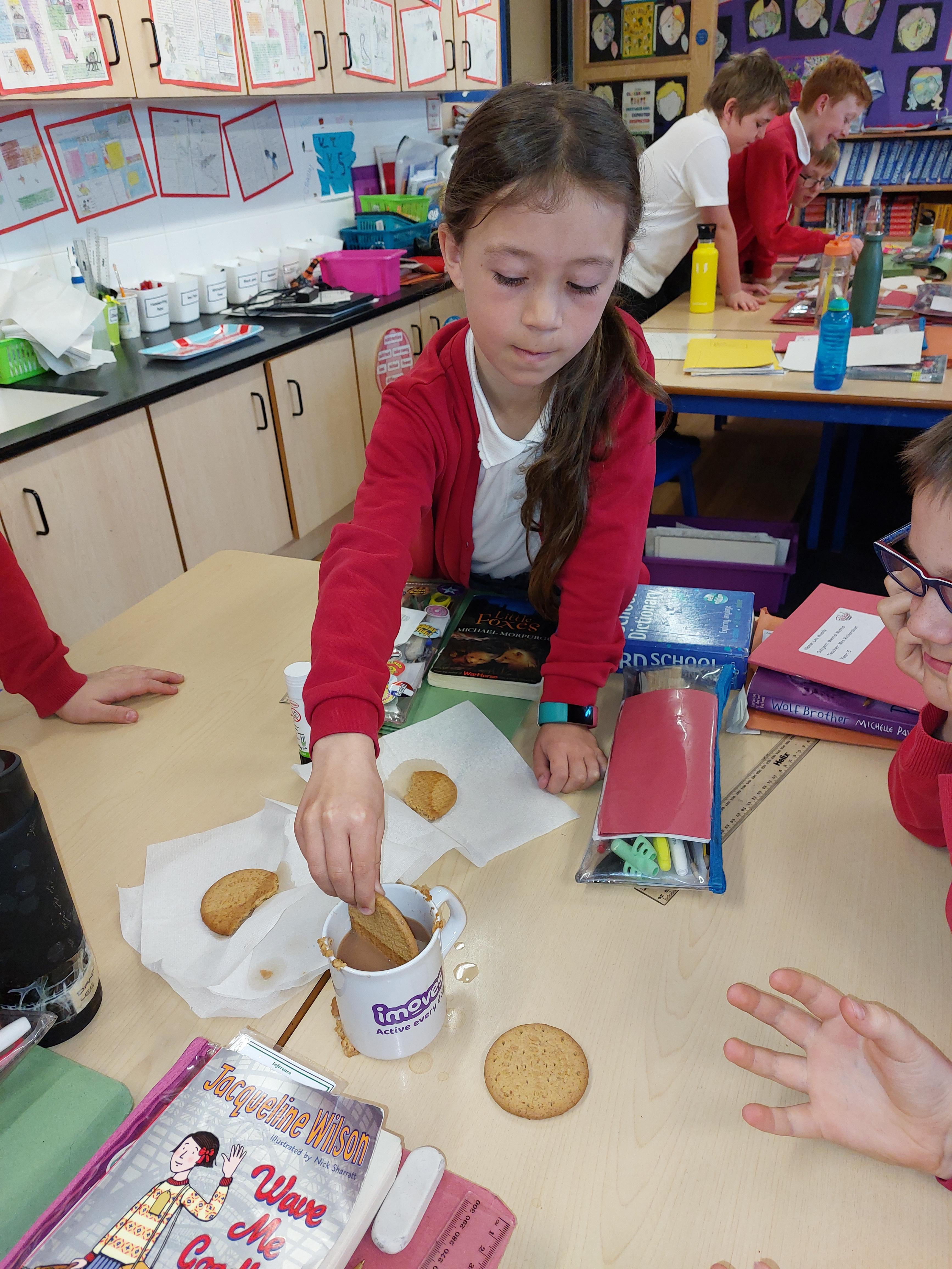 Year 4 had lots of fun during British Science Week. We conducted a fair test to investigate which biscuit is the best to dunk in hot milk. We discussed how we could measure this and decided to time how long it would take each biscuit to break when in the hot milk. We tested digestives, ginger nuts and bourbon biscuits. We recorded our results and discussed these as a class. We came to the conclusion that the bourbon biscuit was the best biscuit to dunk in hot milk as it took the longest time to break. Some of us thought this was because the bourbon biscuit is thicker than the other biscuits. Year 4 really enjoyed this activity!