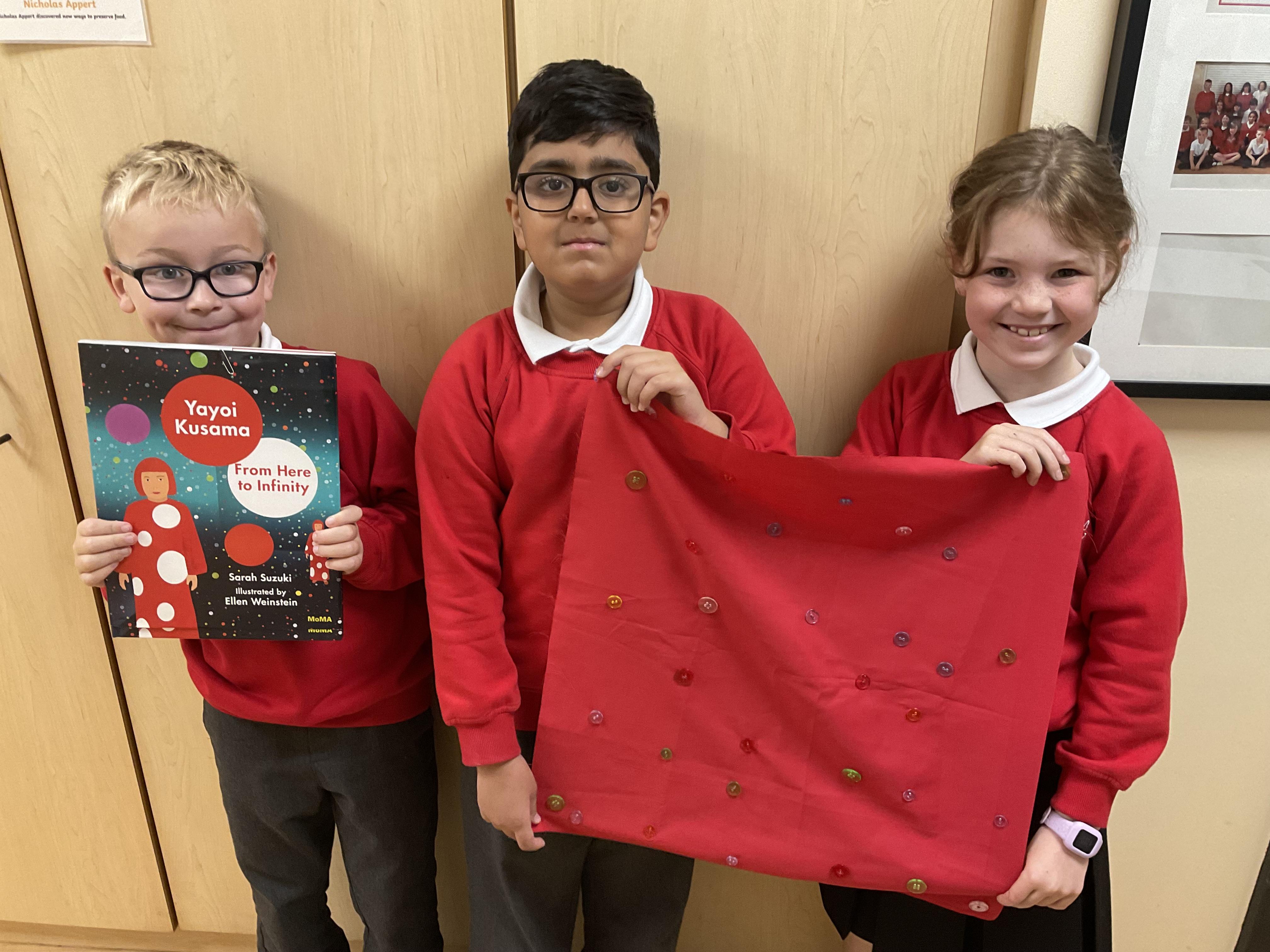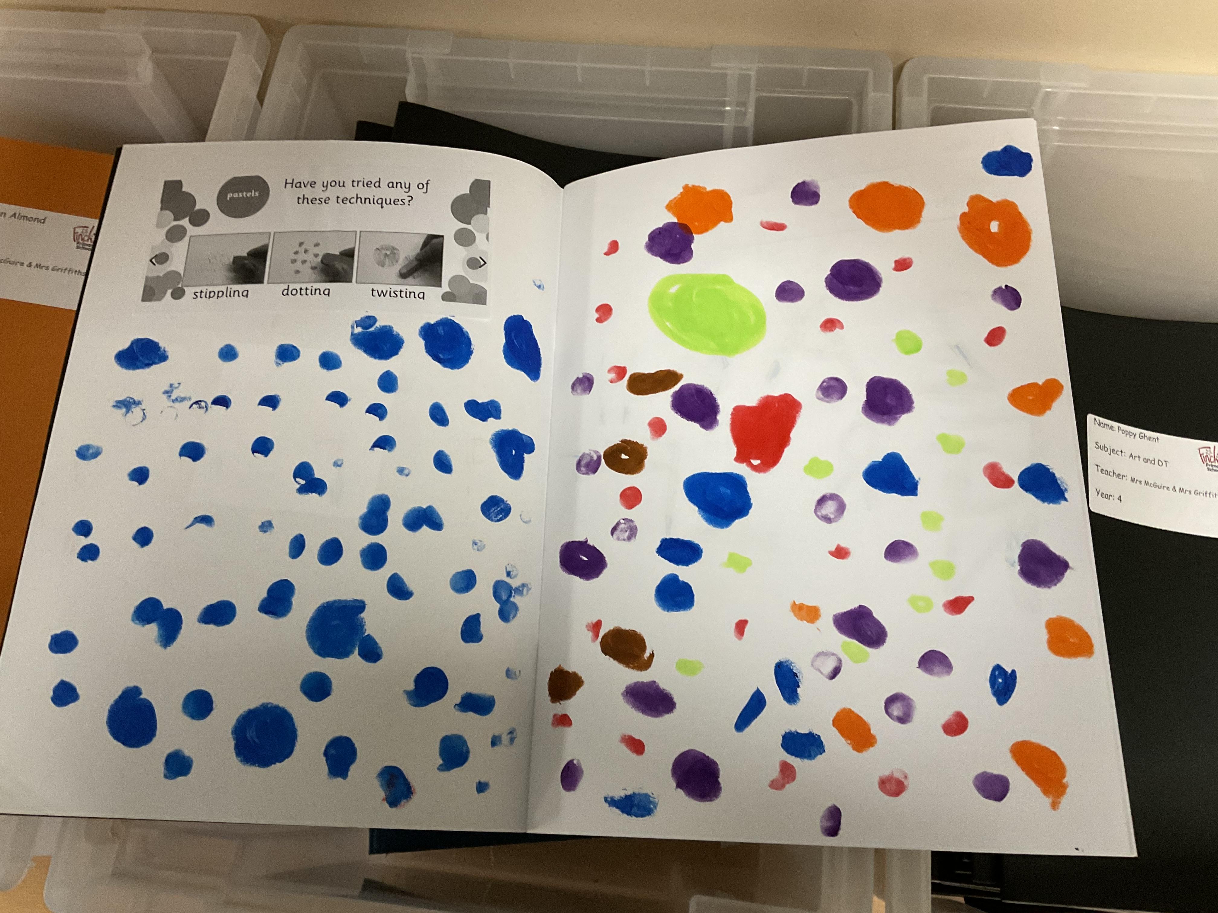 Year 4 used paint sticks to experiment how they could create different dots and then everyone got the opportunity to sew a button onto a piece of material to make a dotty textile.