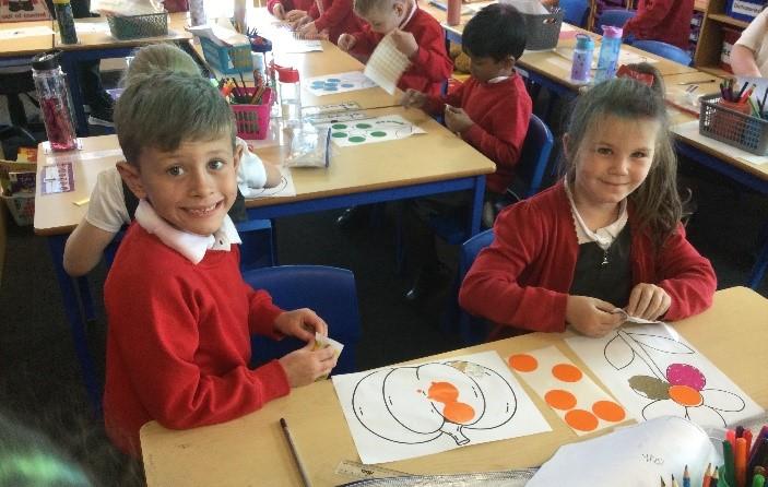 Year 2 used different coloured and sized stickers to recreate Yayoi's pumpkin and a flower inspired by her childhood.