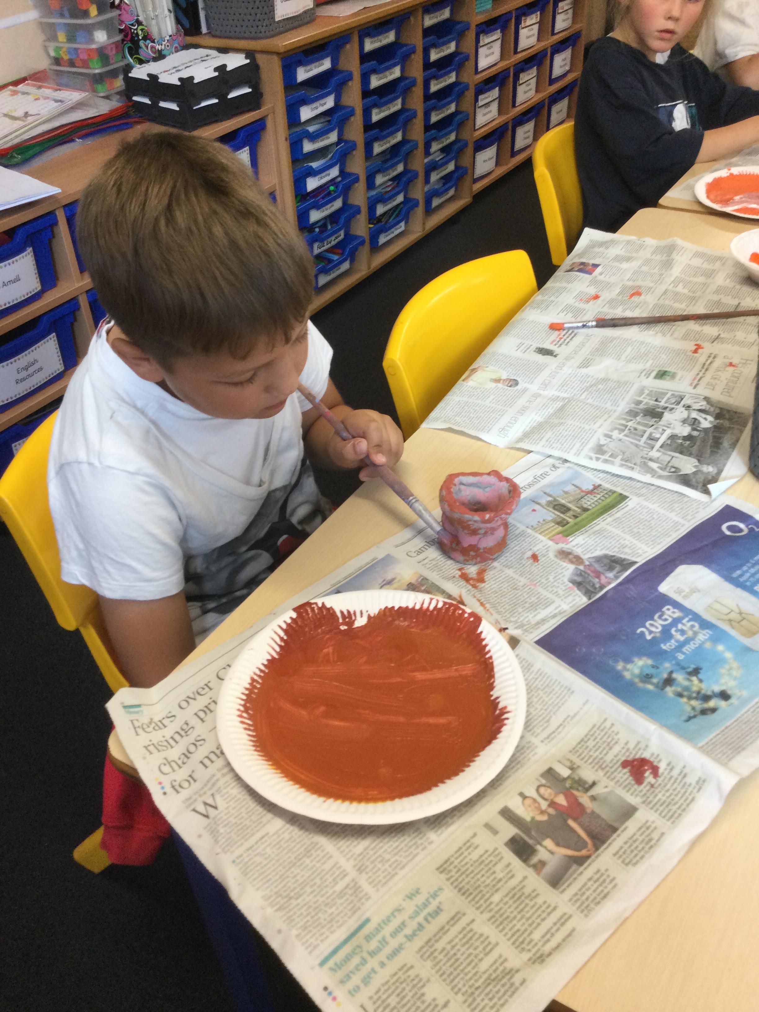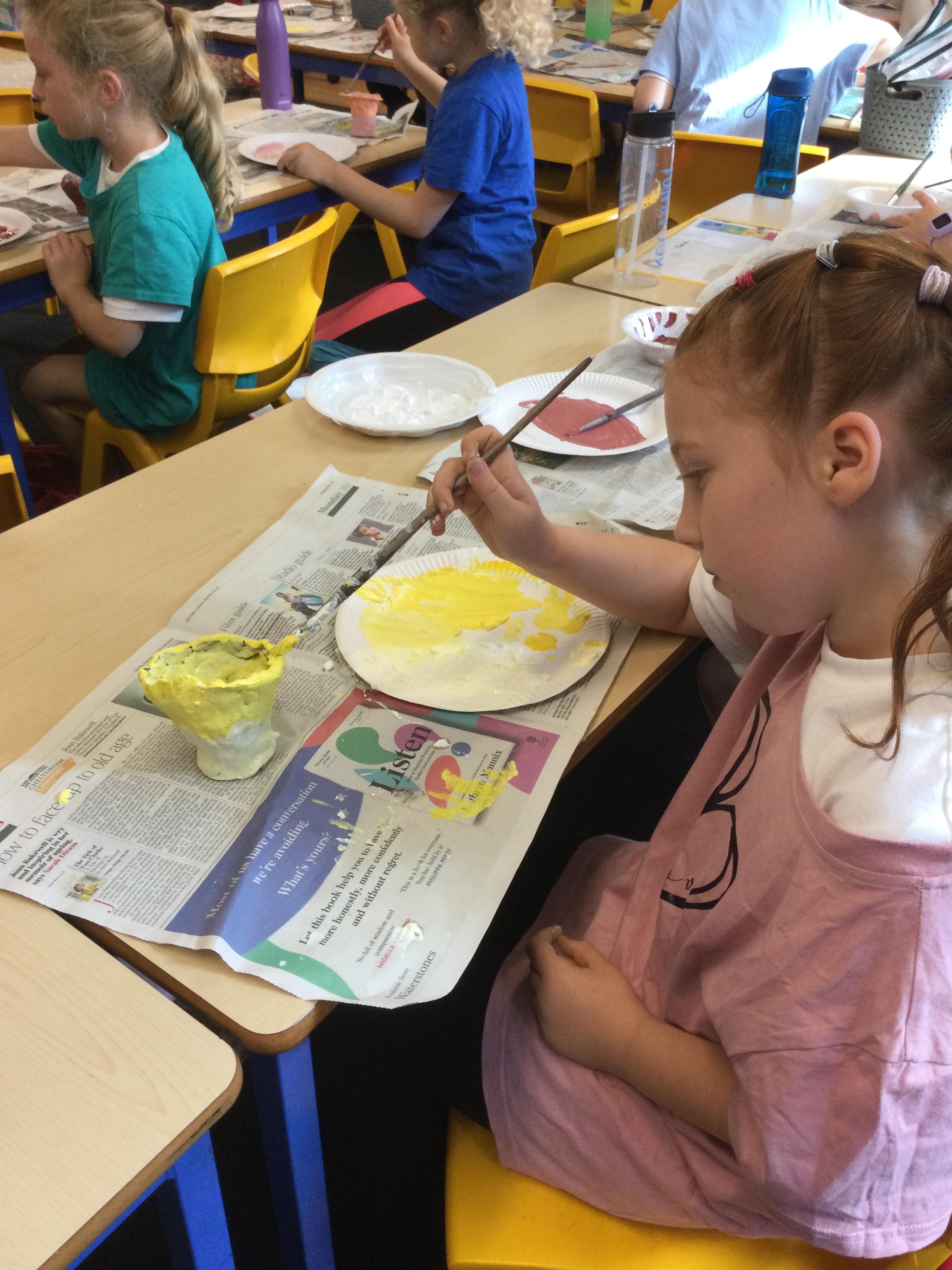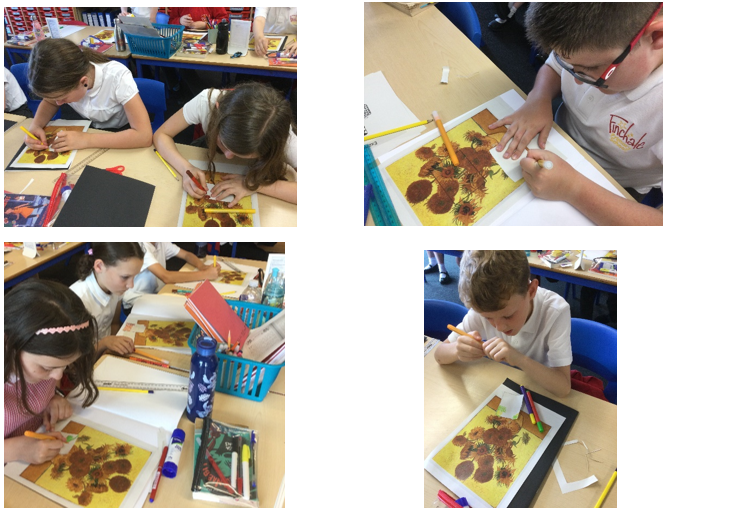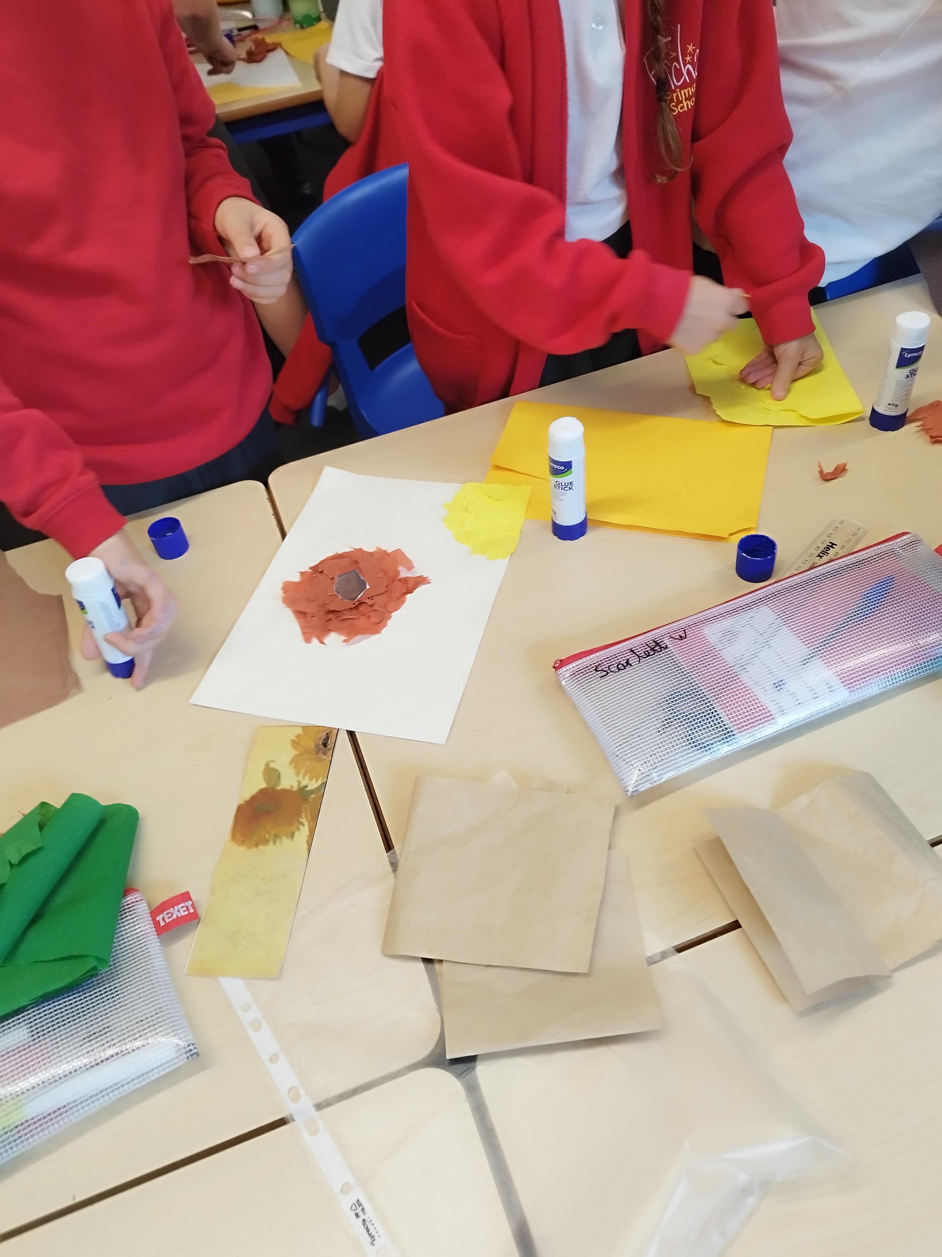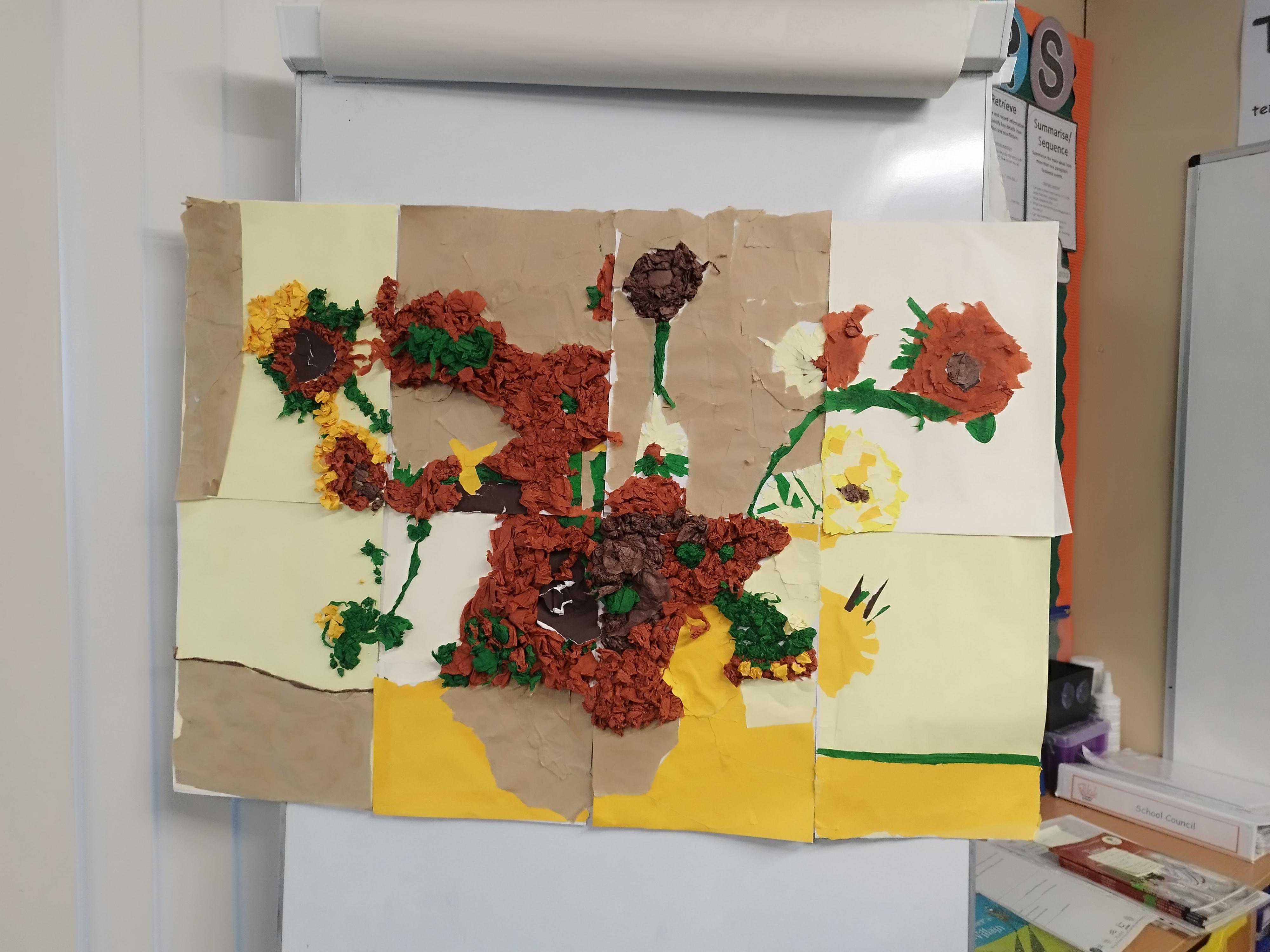 As a whole school we learned about Vincent Van Gogh and each class took a different element of his sunflower painting to produce our own Art.
