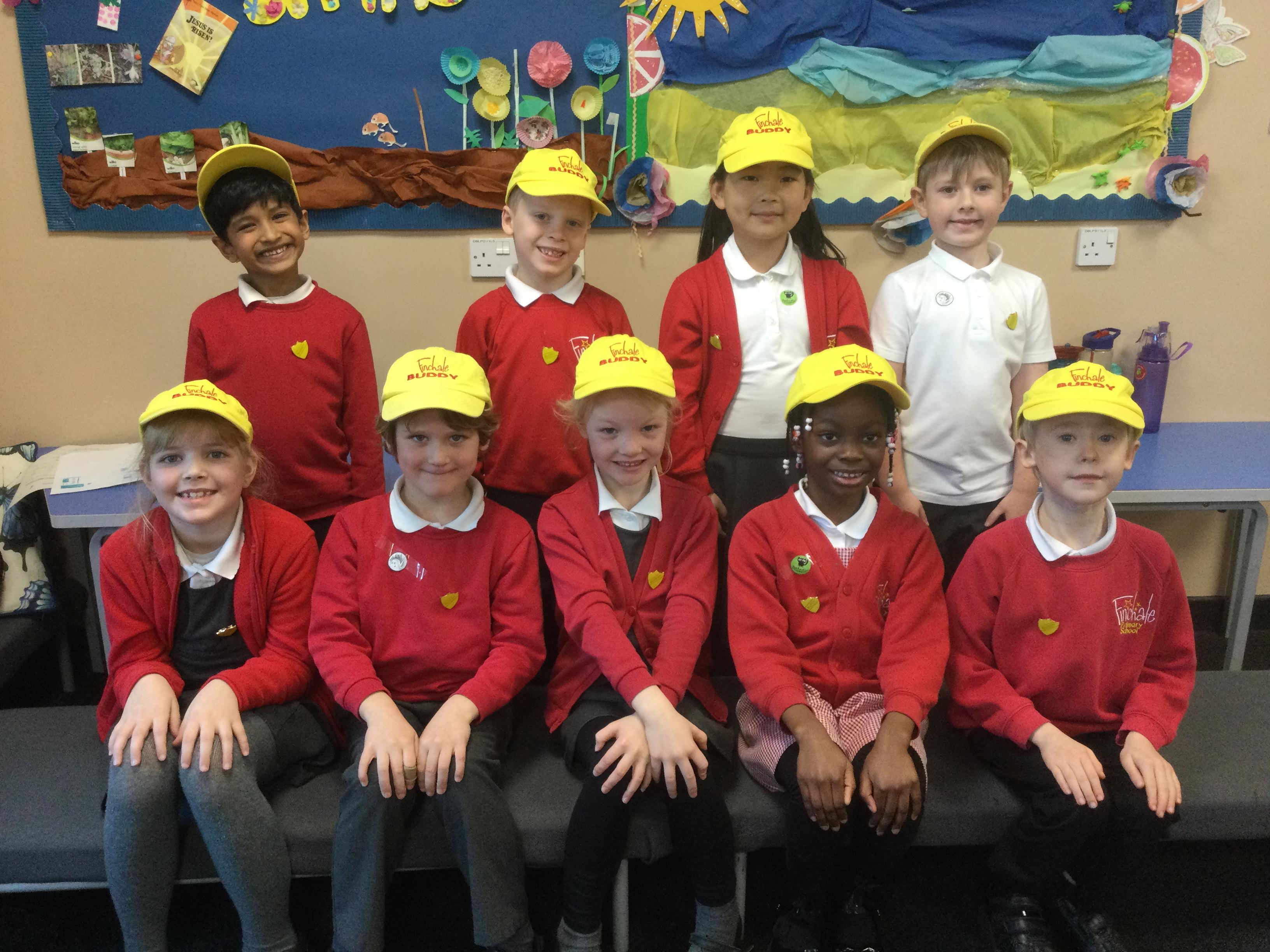 You can identify our Wellbeing Buddies by their yellow caps and badges which they proudly wear!