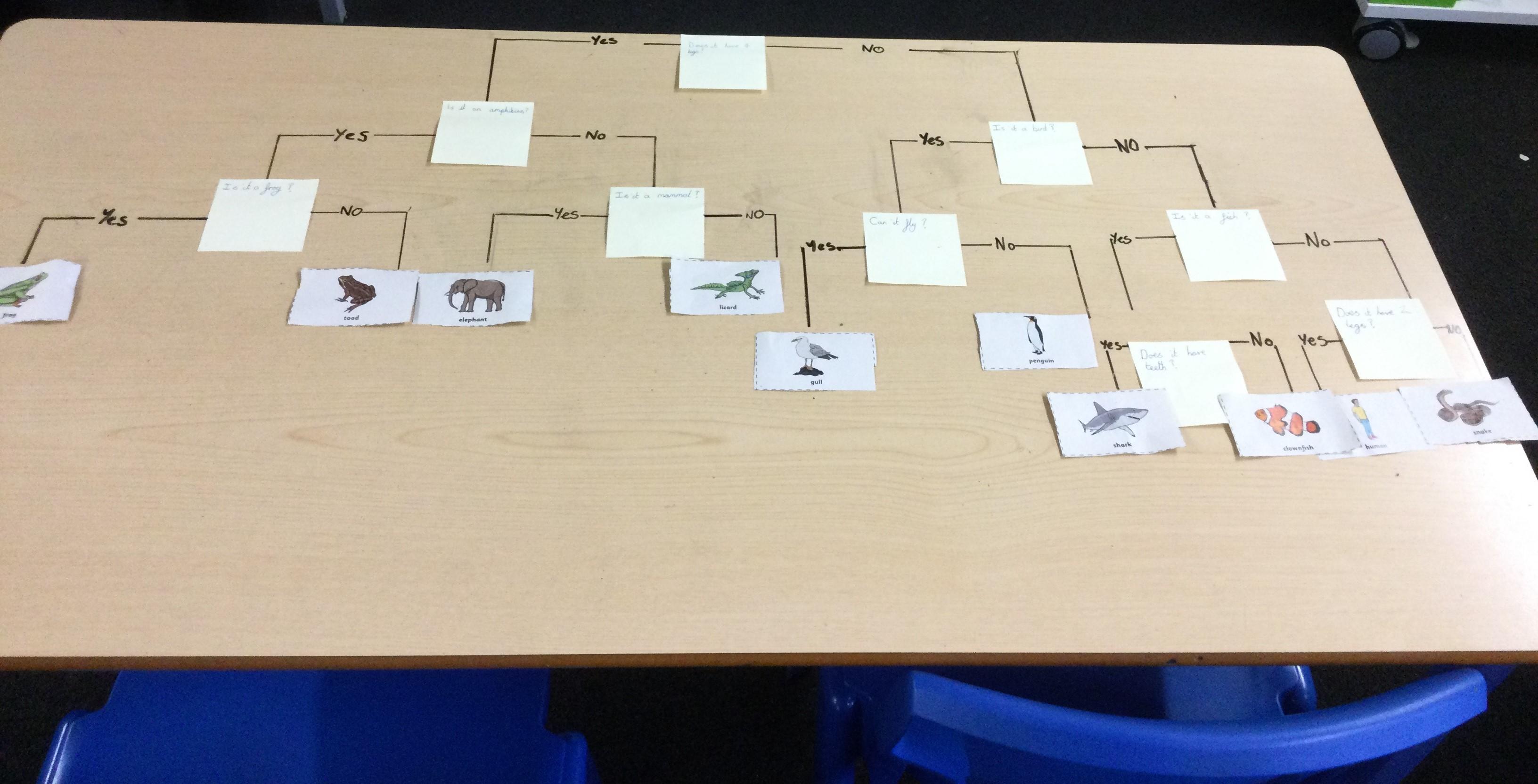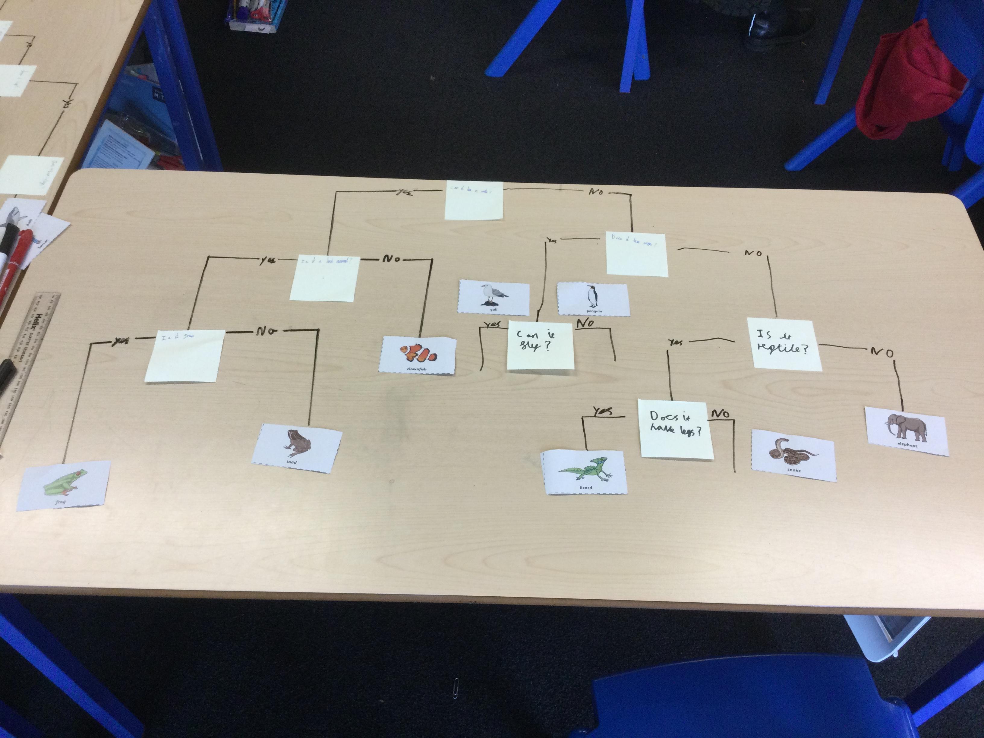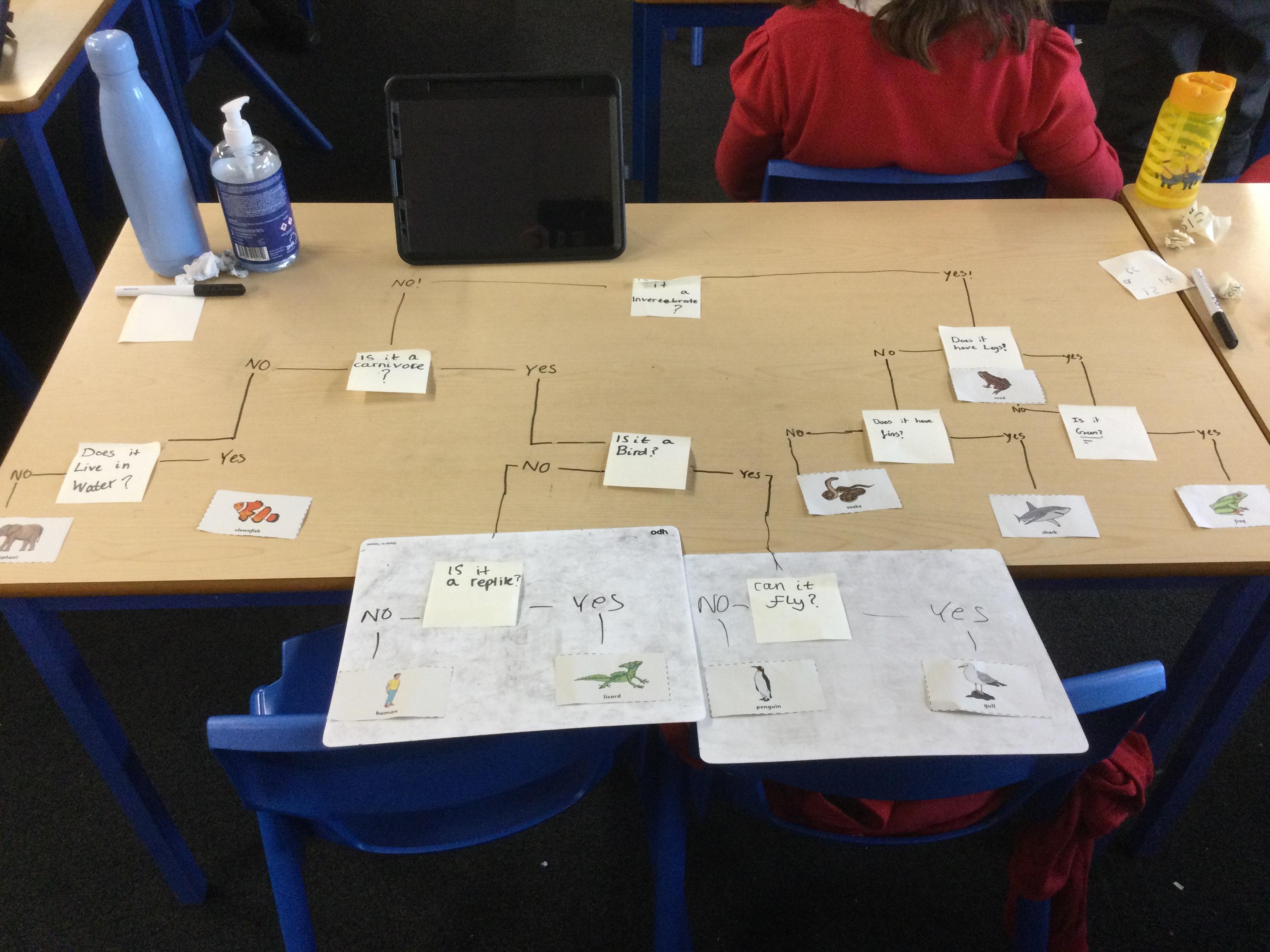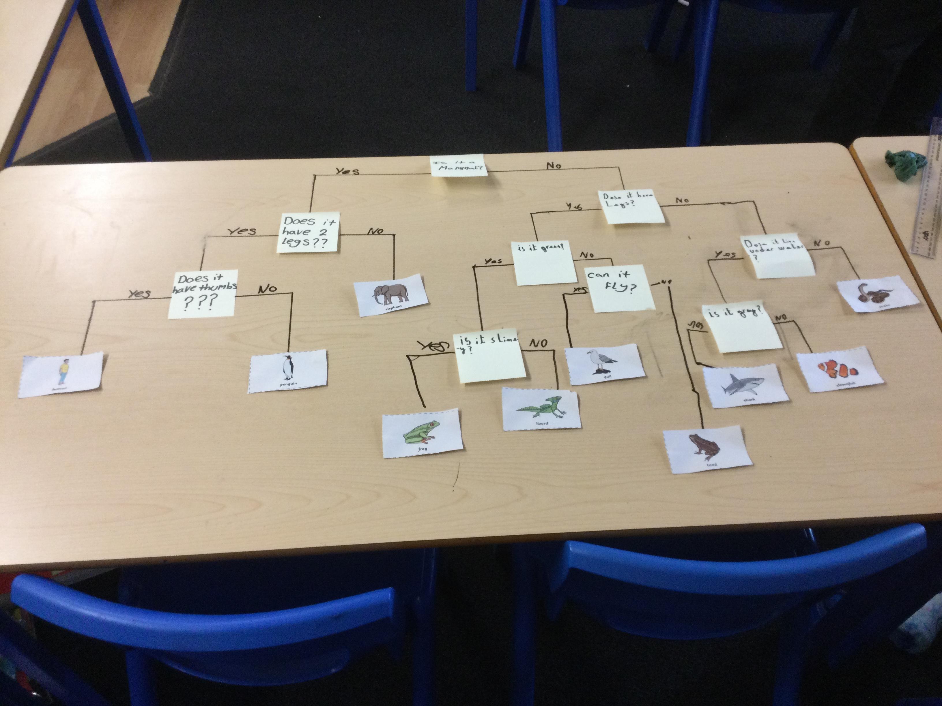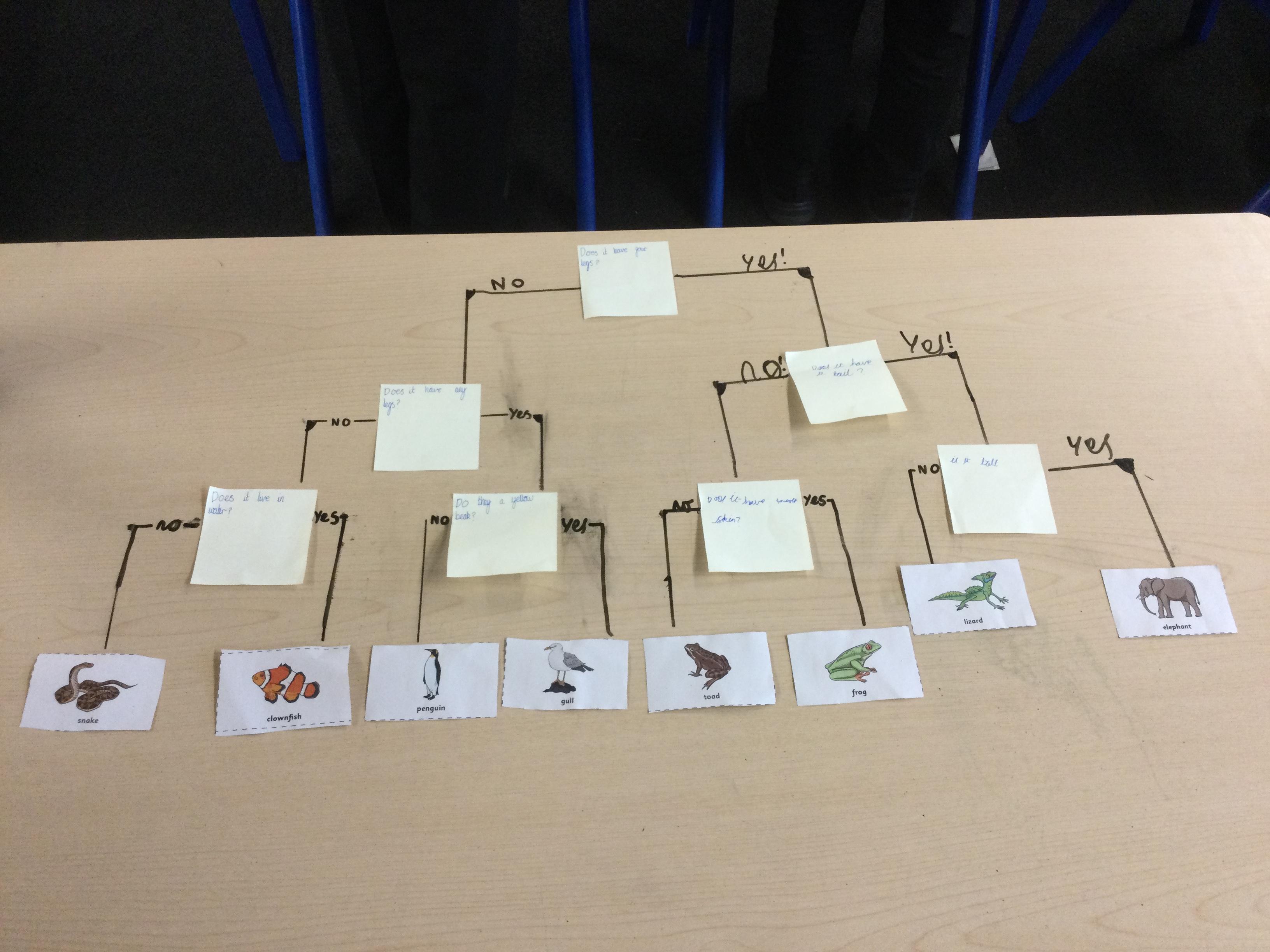 As part of our work on classifying animals, we created our own classification key. To do this, we created a set of scientific questions to group animals as to whether the answer to the question was yes or no. We set our work out on our tables so that we could see it clearly. After we had completed our classification keys, we then checked other groups to see if they were accurate. We really enjoyed carrying out this activity.
